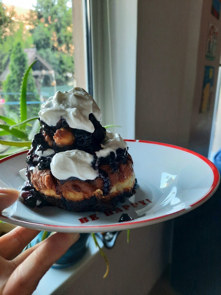 Le promisesem, așa că am făcut papanași. Cu gem de afine de la părinții mei și cu smântână grasă. Am prăjit șase, care au ieșit faini, rumeni și babani. Pe măsură ce unii se perpeleau în tigaie, pe cei deja făcuți îi decoram cu moț, gem și smântână. Primul a fost pentru Zmeu, care mă asista și plescăia pofticios încă de când mă apucasem de treabă. I l-am tăiat în bucățele, i-am dat o furculiță și astfel nu i-am mai auzit gura o vreme.